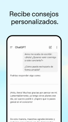 La creatividad florece con ChatGPT a tu lado. Desde generar ideas originales para obsequios especiales hasta personalizar mensajes de felicitación únicos, tu ingenio se expandirá. Además, obtén orientación a medida: formula respuestas personalizadas para comunicaciones delicadas o desglosa situaciones complejas con claridad. Para el aprendizaje, ChatGPT se adapta a cada mente: explica conceptos como la electricidad a un joven entusiasta de los dinosaurios o simplifica eventos históricos complejos. En el ámbito profesional, funciona como tu co-piloto estratégico, facilitando la lluvia de ideas para textos publicitarios impactantes o el desarrollo de planes de negocio sólidos. Incluso en la cocina, resuelve dilemas con sugerencias de recetas ingeniosas a partir de los ingredientes que tengas a mano.